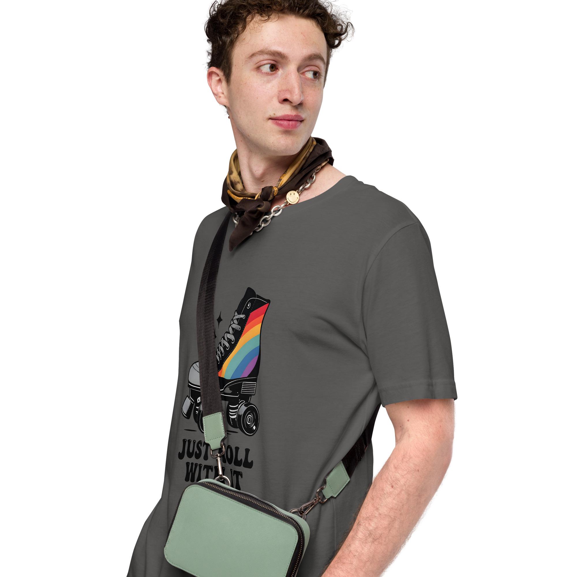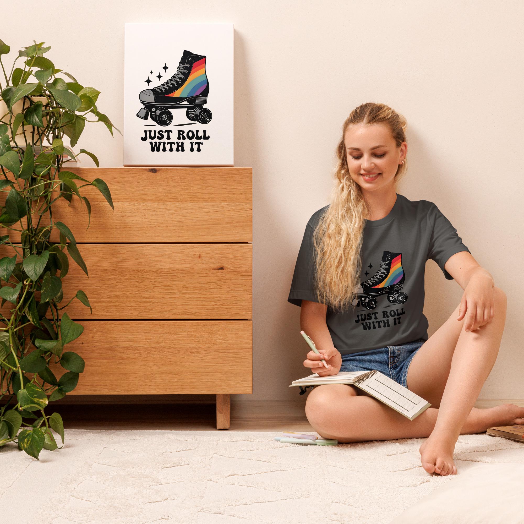 Stay cool, colorful, and carefree in this retro-inspired "Just Roll With It" T-shirt! Featuring a black roller skate with a vibrant rainbow on the side and a positive, go-with-the-flow message, this tee is perfect for skaters, 80s & 90s lovers, and anyone who loves a little nostalgia with their style!