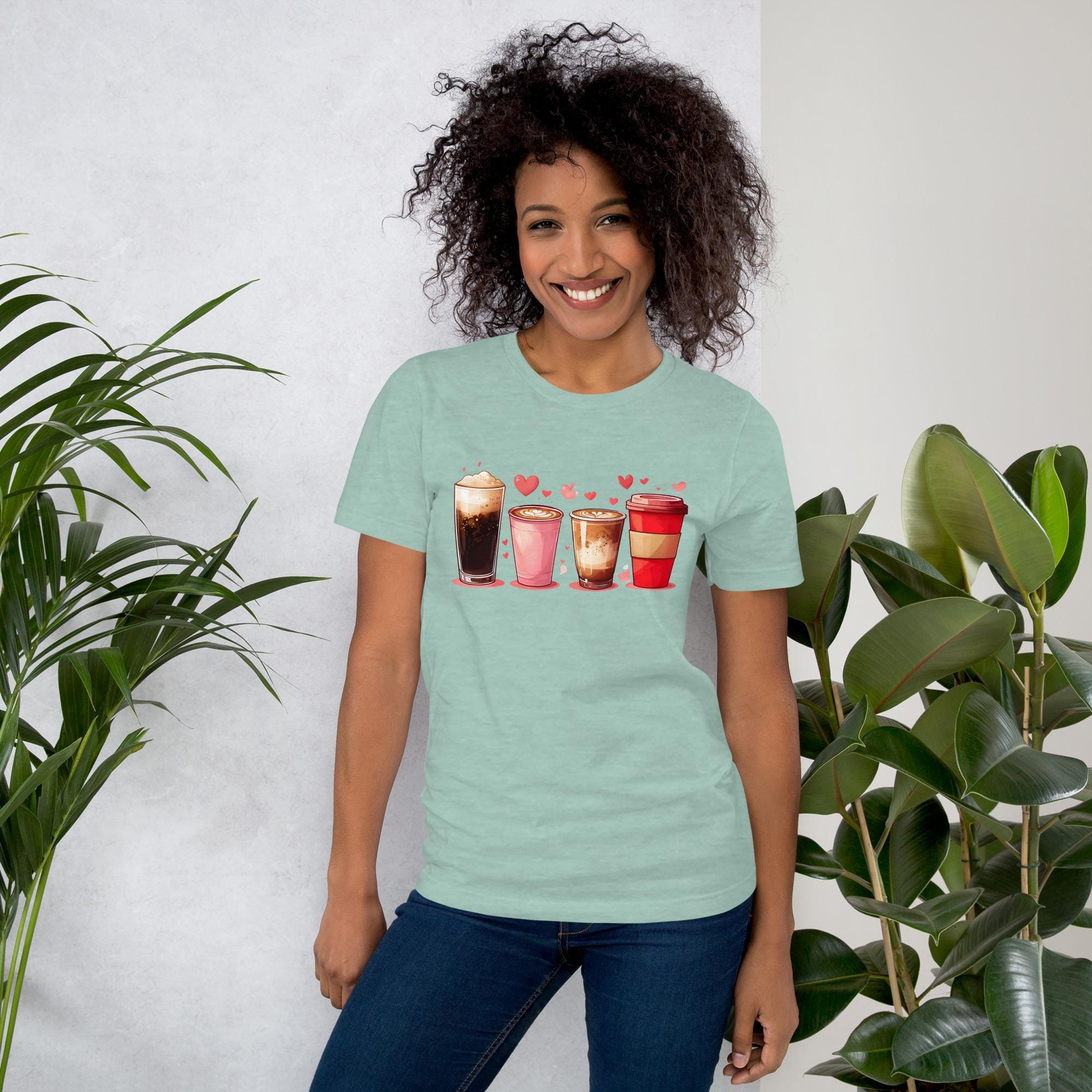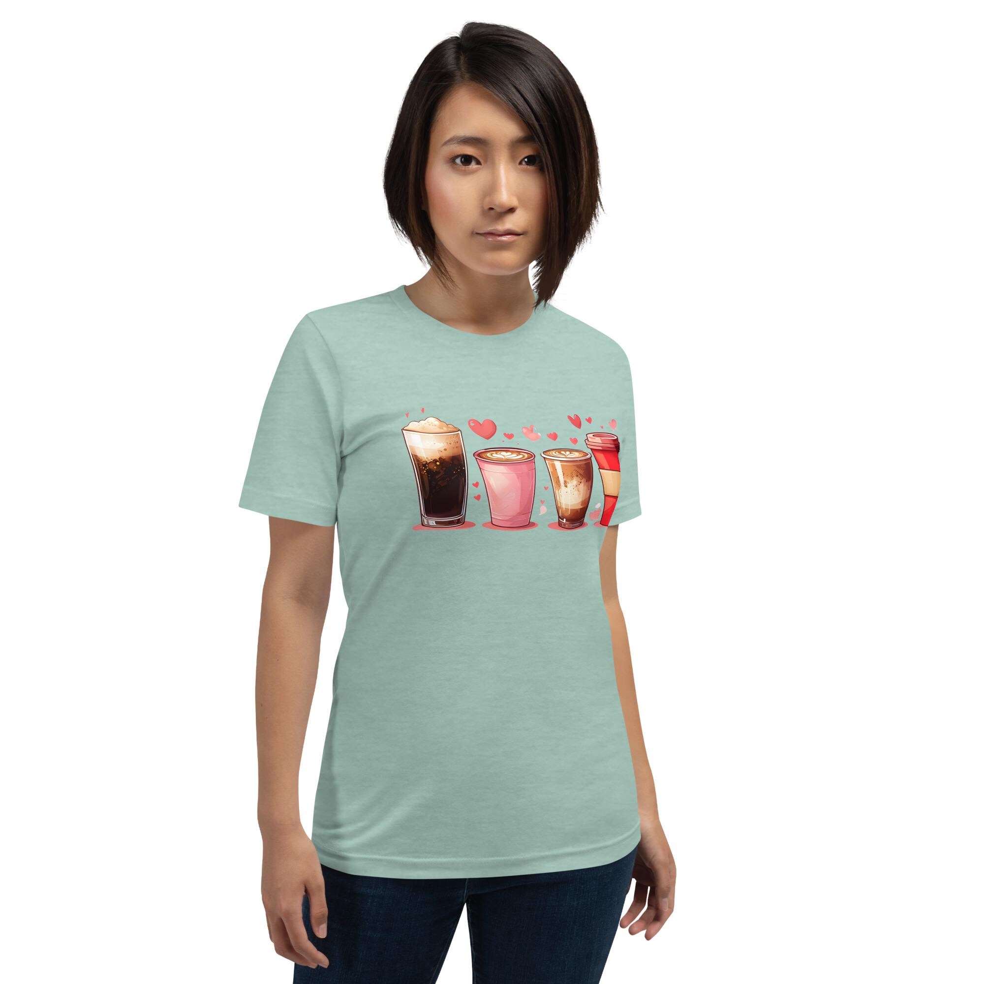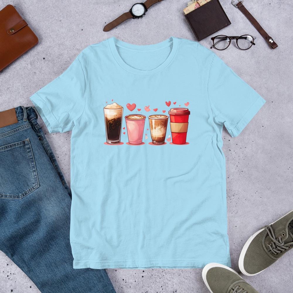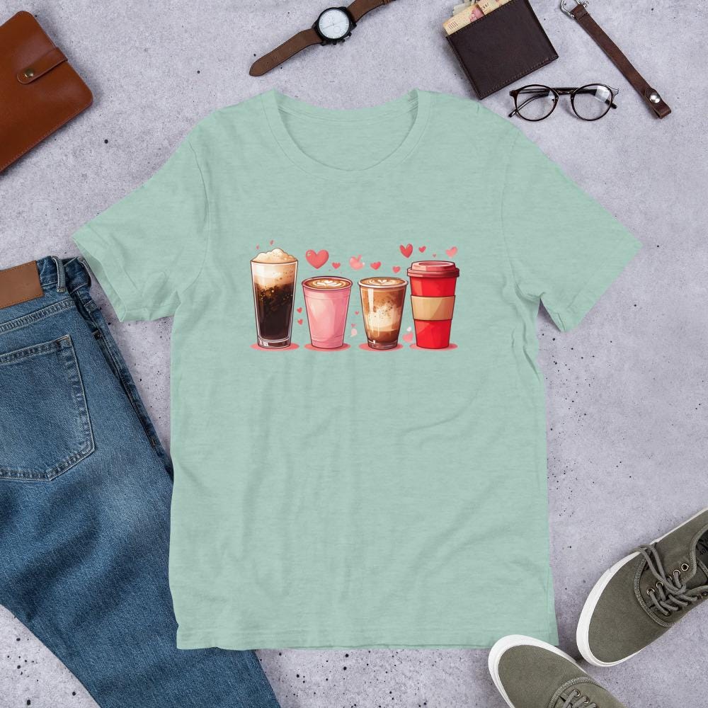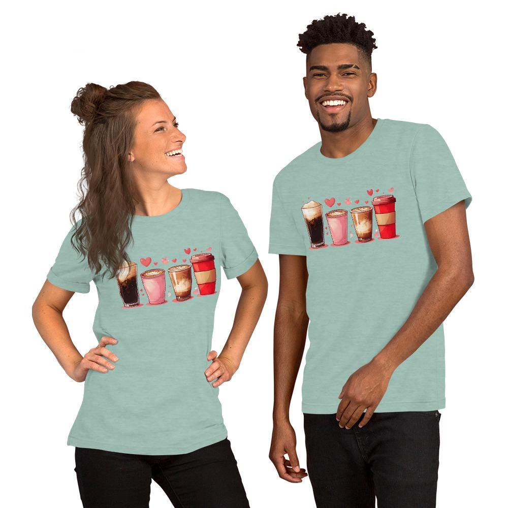 Start your day with style and a little extra love in this adorable coffee-themed T-shirt! Featuring two tall coffee tumblers and two grande latte cups with hearts in the foam, this cozy and cute tee is perfect for coffee dates, barista life, Valentine’s Day, or anyone who runs on caffeine and love!